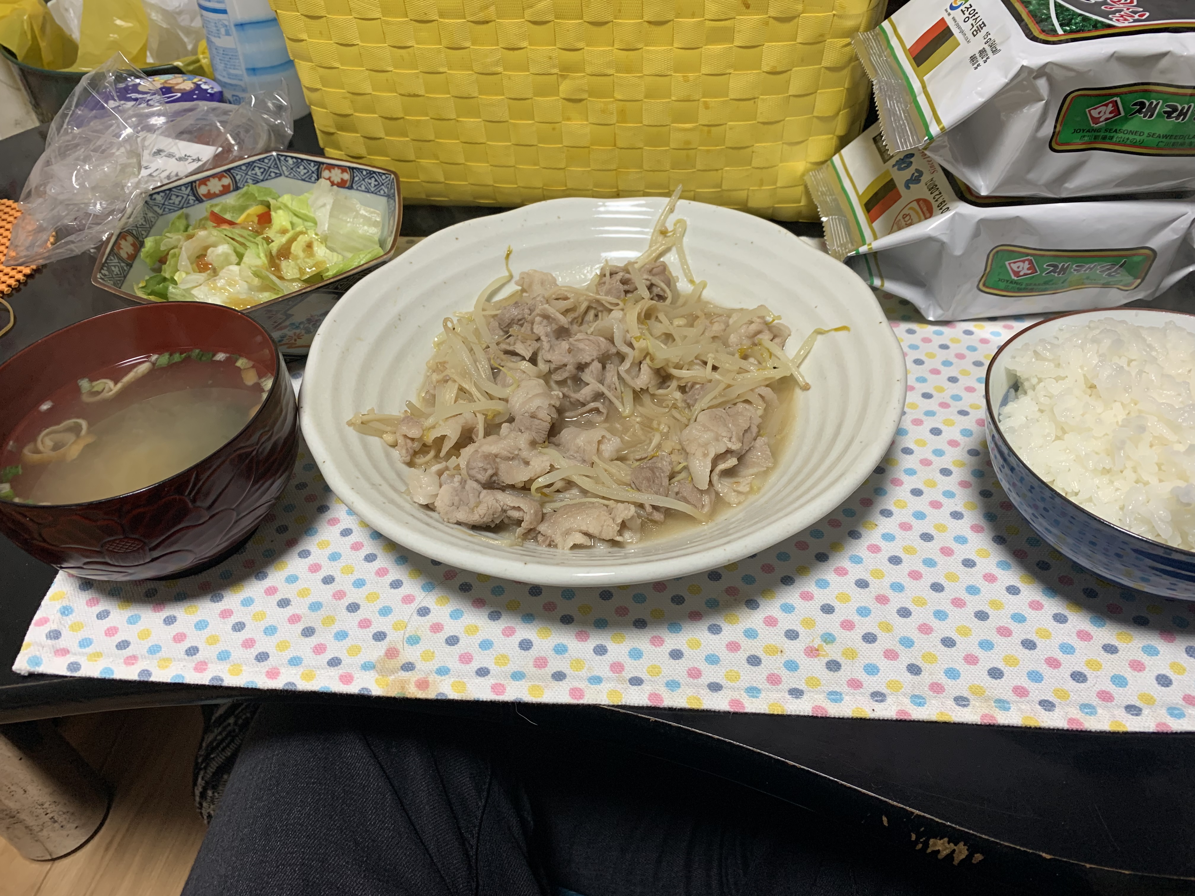 内容はサラダ・ご飯・味噌汁・えのきともやしと豚バラの塩だれ炒めです。